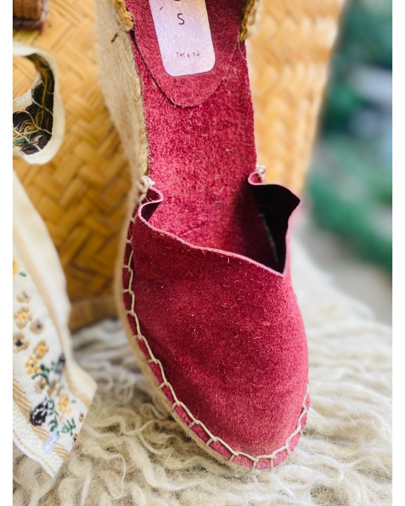 El modelo Marta es una espardeña de cuña que combina sofisticación, tradición y estilo contemporáneo. Su pala está elaborada en piel de serraje de color cardenal, un tono profundo y elegante que aporta fuerza y distinción a cualquier look. La suela de yute natural está cosida a mano con puntadas visibles, homenajeando la esencia más auténtica de nuestras raíces.