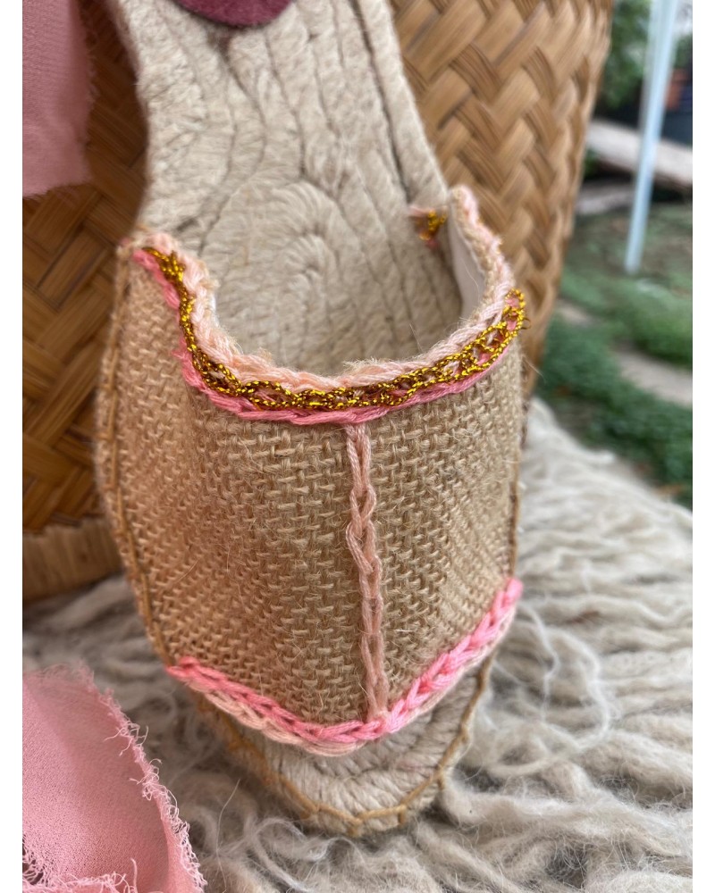 Las espardenyes Farigola son una oda a la feminidad y la tradición mediterránea. Confeccionadas a mano con una pala de yute natural forrado y delicadamente bordadas a mano, destacan por sus suaves cintas de gasa en color rosa empolvado que aportan dulzura, ligereza y un aire romántico. Su suela plana de un centímetro las convierte en el calzado ideal para caminar con elegancia y comodidad, tanto en el día a día como en ocasiones especiales.