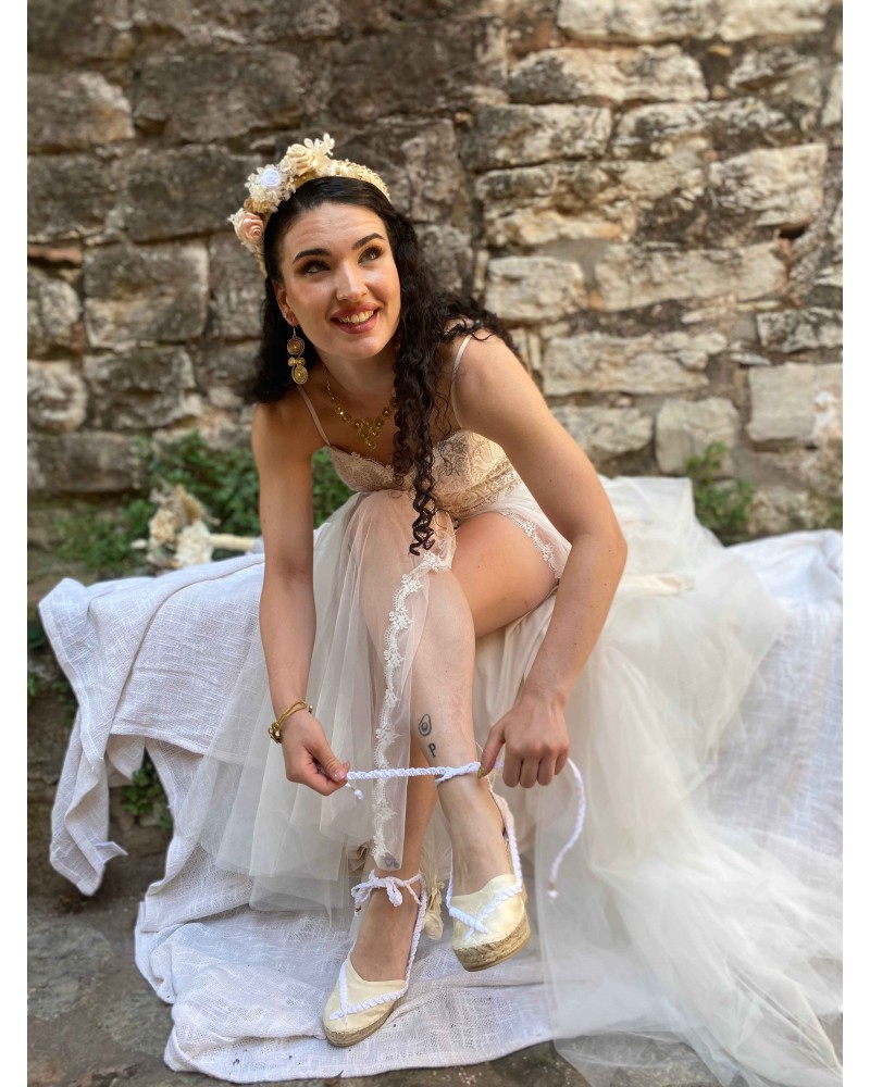 El detalle de sus cintas en flor añade un toque romántico y delicado, perfecto para novias que buscan elegancia con esencia artesanal y un aire mediterráneo único.