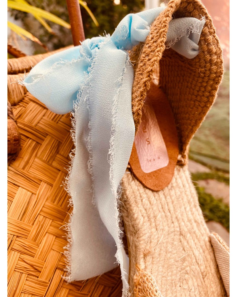 La pala de jute folrada, suau i delicada, s’adora amb un detall de pedres blaves que recorden el brillantor del mar. Els llacets de gasa orgànica s’atenen al turmell amb subtilesa, envoltant el peu amb gràcia i lleugeresa.