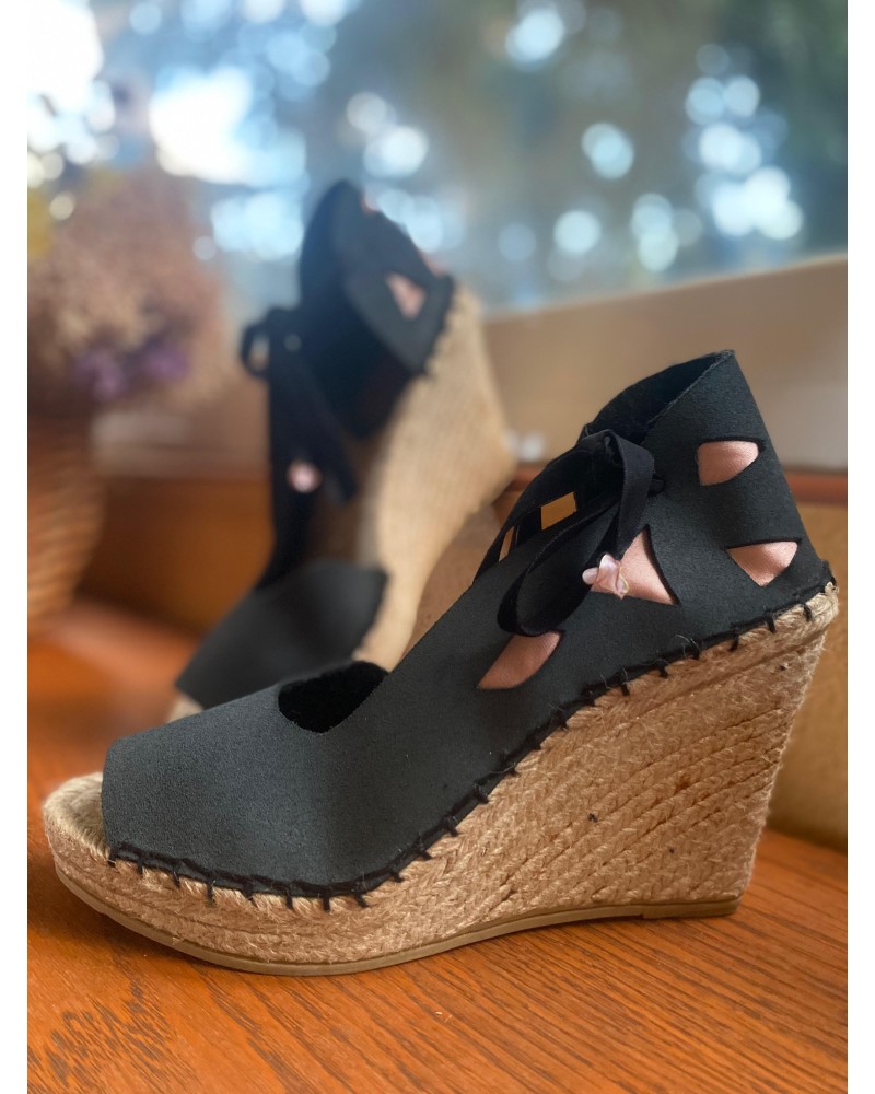 El lazo de terciopelo negro abraza el empeine con carácter, mientras la cuña trenzada mantiene la esencia mediterránea que define nuestras Montserratines.